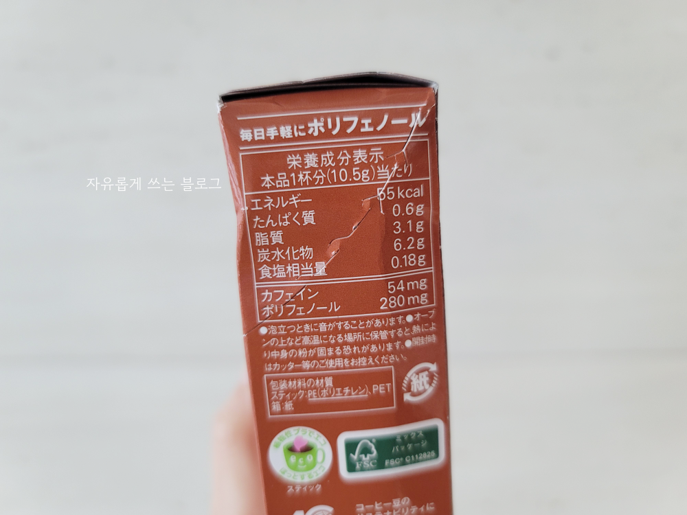 스틱 1개당 칼로리는 55kcal이고, 카페인은 54mg, 폴리페놀은 280mg이 들어있다고 합니다.
