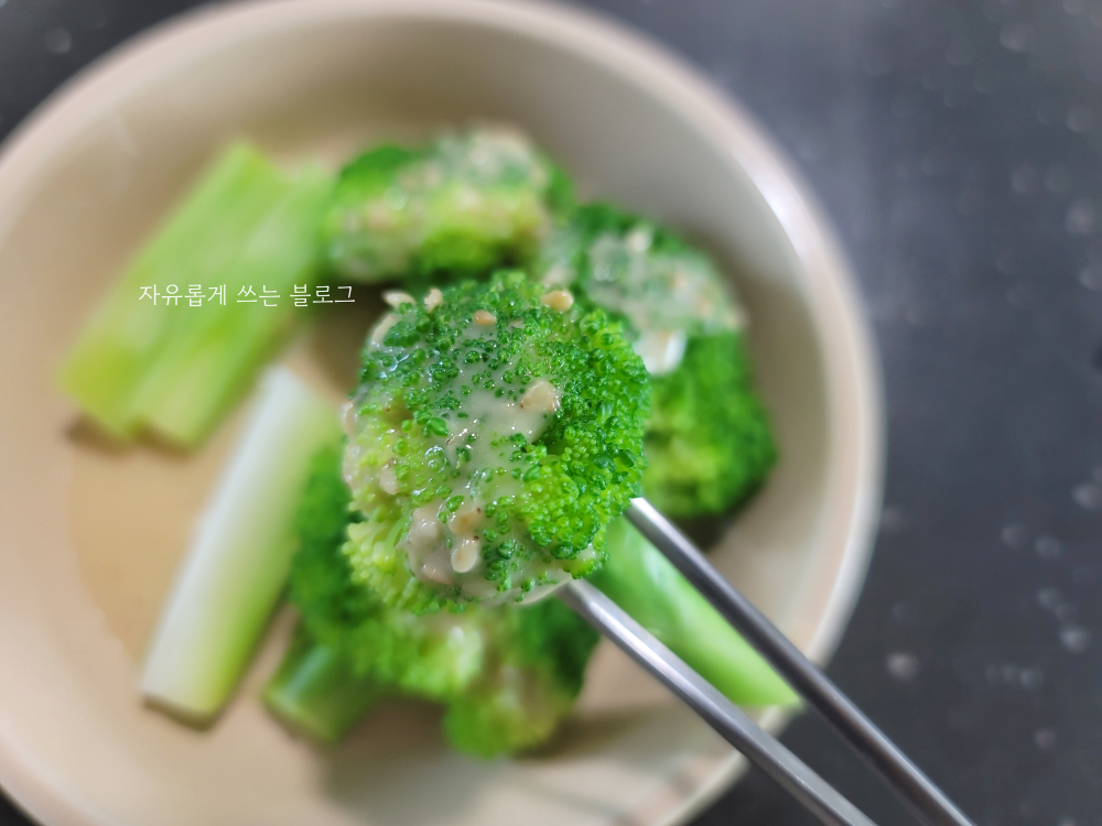요즘 브로콜리를 데쳐서 즐겨 먹고 있는데요. 데친 브로콜리에 살짝 뿌려 먹어보았습니다.