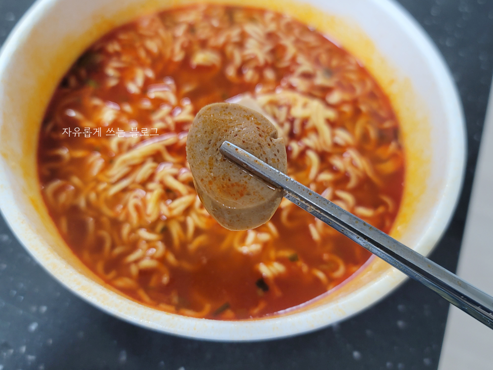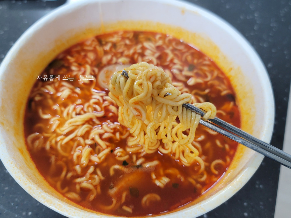 면부터 먼저 맛을 보았는데요. 의외로 면 식감이 쫄깃하면서 괜찮더라고요. 개인적으로 쫄깃한 면발을 좋아하는데 딱 제가 좋아하는 식감이었어요.👍