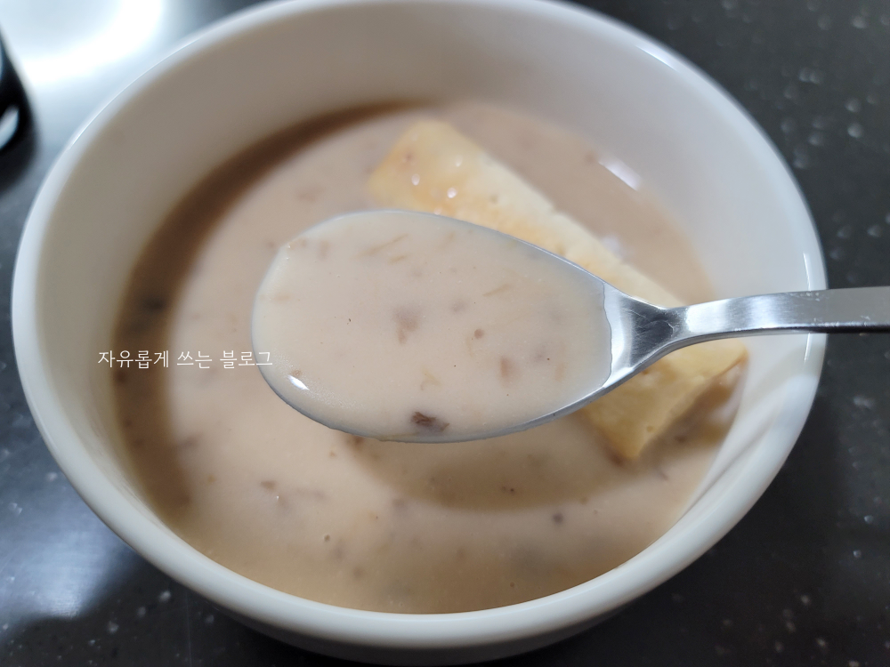 그리고 스프를 떠서 맛보았습니다. 부드러우면서도 고소한 풍미가 느껴져서 맛이 꽤 괜찮다는 생각이 들더라고요.