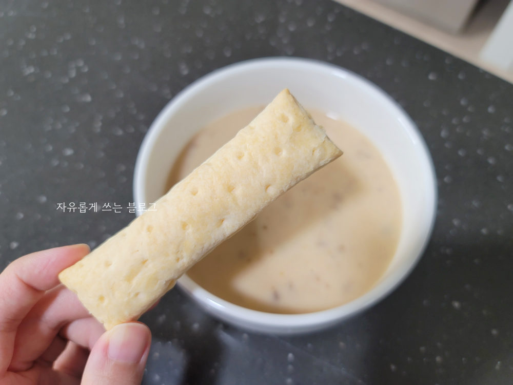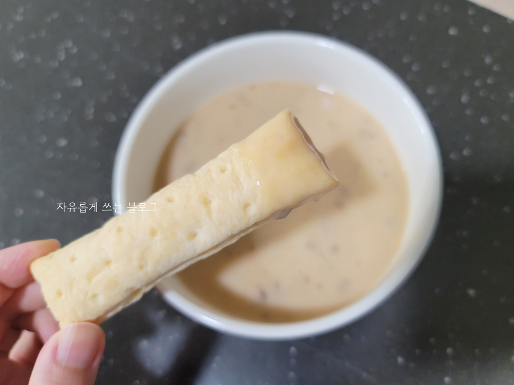 잘게 부숴 넣어서 촉촉하게 먹을까 고민하다가 일단 찍어서 맛을 보기로 했습니다.