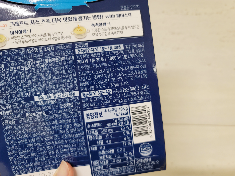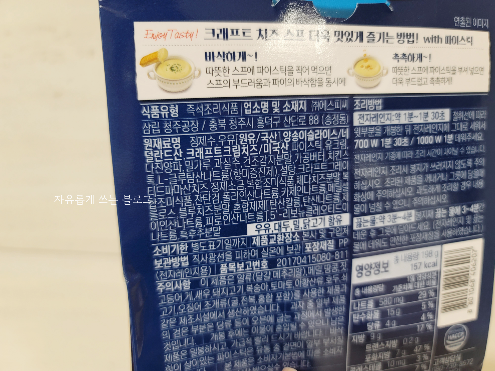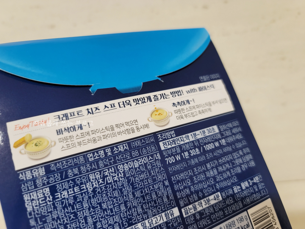 스프와 찰떡궁합을 이루는 파이스틱이 별첨되어 있고, 4가지 치즈(크림치즈, 체다치즈, 파마산, 블루치즈)가 들어있다는 설명도 보입니다.