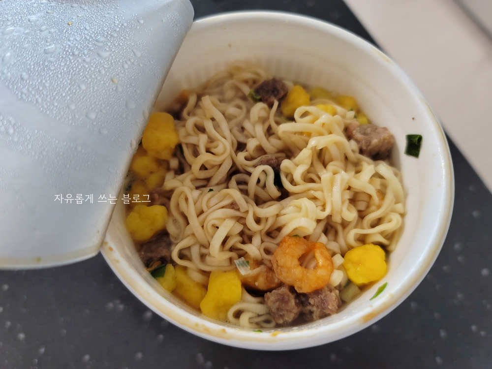 조리방법대로 뜨거운 물을 붓고 뚜껑을 덮어 3분간 기다린 다음 오픈을 한 모습입니다.