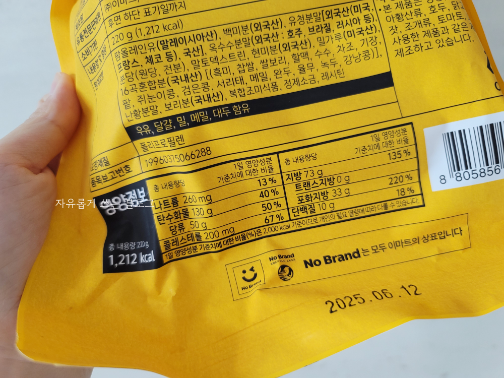 노브랜드 크리스피롤 칼로리를 살펴보면 총 내 용량 220g에 1,212kcal 라고 적혀 있어요.