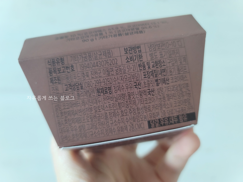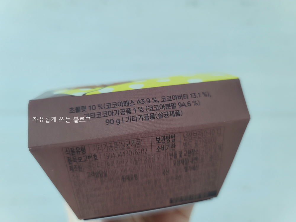 초콜릿 10%와 기타코코아각공품 1%가 들어갔다고 적혀 있네요. 가공초콜릿이 아닌 진짜 초콜릿을 넣어 초코맛을 제대로 살린 듯 합니다.