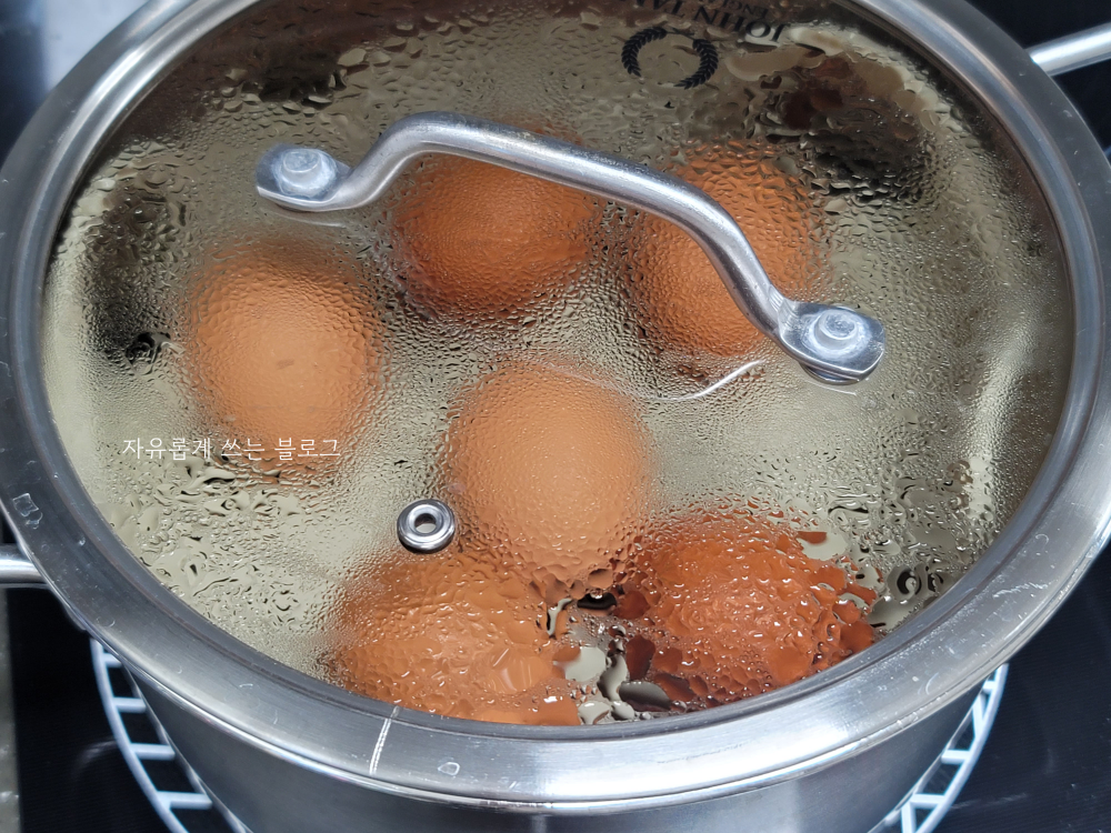 전 완숙으로 먹으려고 10분 정도 쪄 주었는데요. 시간이 되면 불을 끄고 뚜껑을 열어 식혀줍니다.