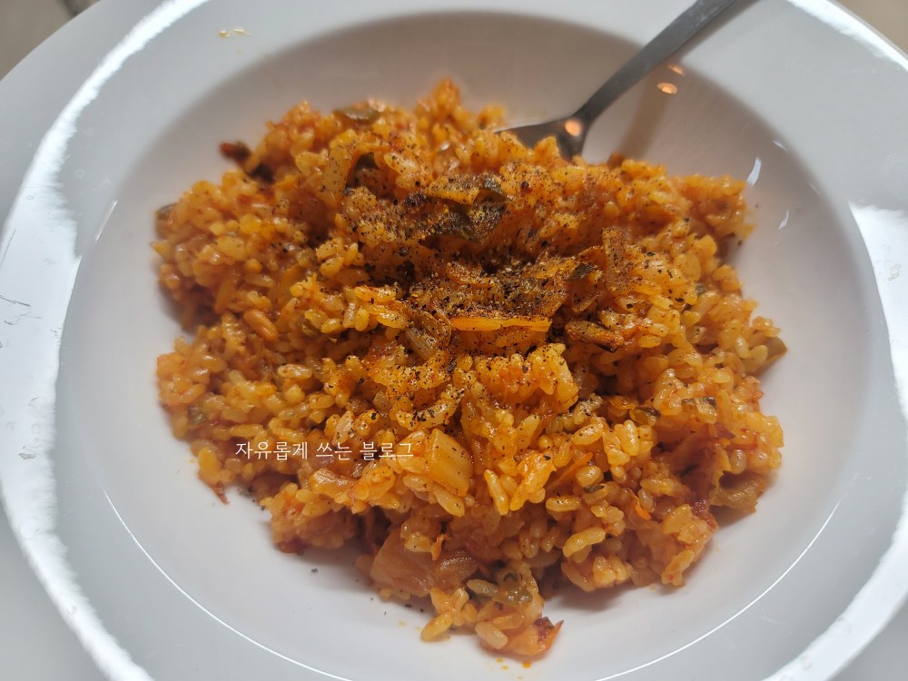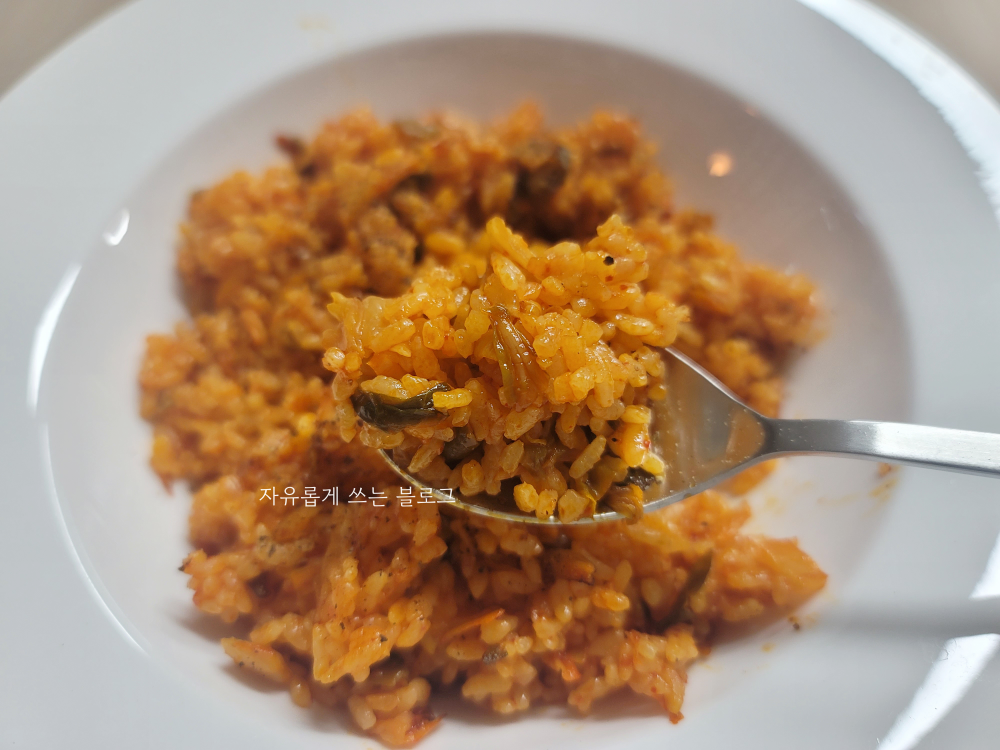 밥알은 고슬고슬하게 잘 볶아진 느낌이고, 중간중간 매콤 새콤한 김치가 아삭하게 씹히면서 맛을 더해줍니다.