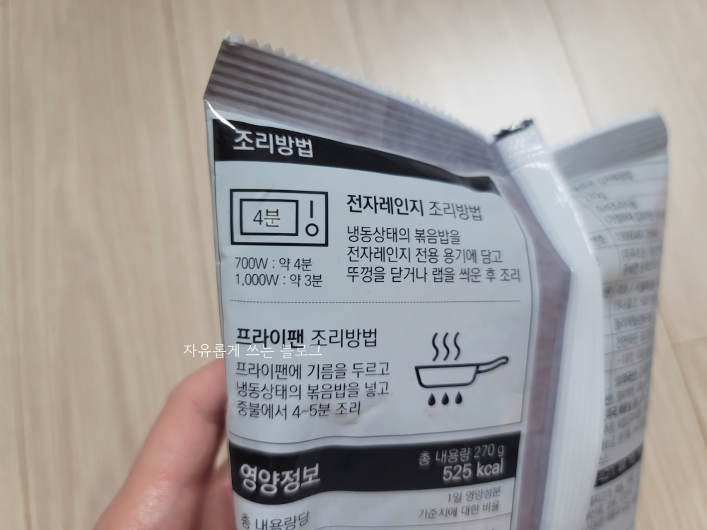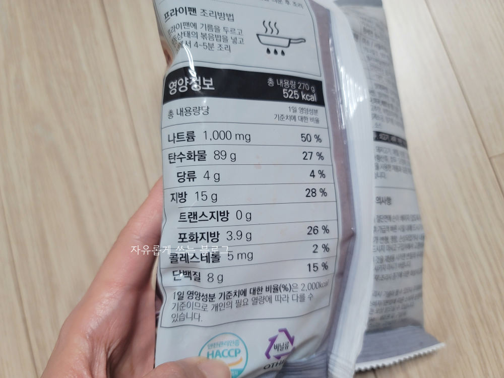 1인분 당 270g이 들어 있습니다. 개인적으로 이런 냉동 볶음밥은 270~300g 정도는 되어야 한 끼 든든하게 먹을 수 있더라고요.