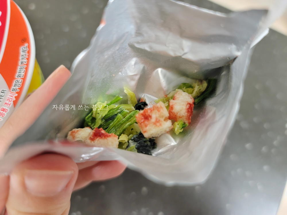 건더기스프를 뜯어서 살펴보니 건청경채와 맛살후레이크 등이 보입니다. 나름 디테일을 살린 느낌!👍