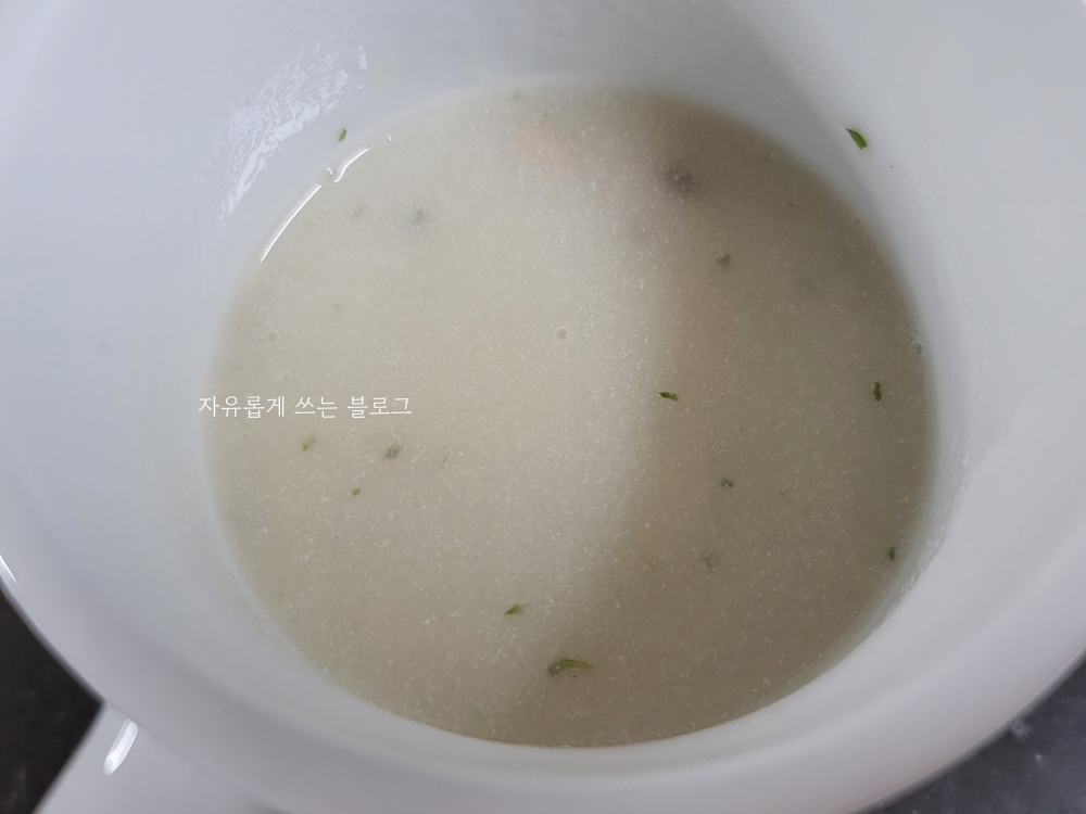 뽀얀 빛깔의 스프에 파슬리, 양송이 버섯(아주 작은 조각!)이 함께 들어 있는 모습입니다.