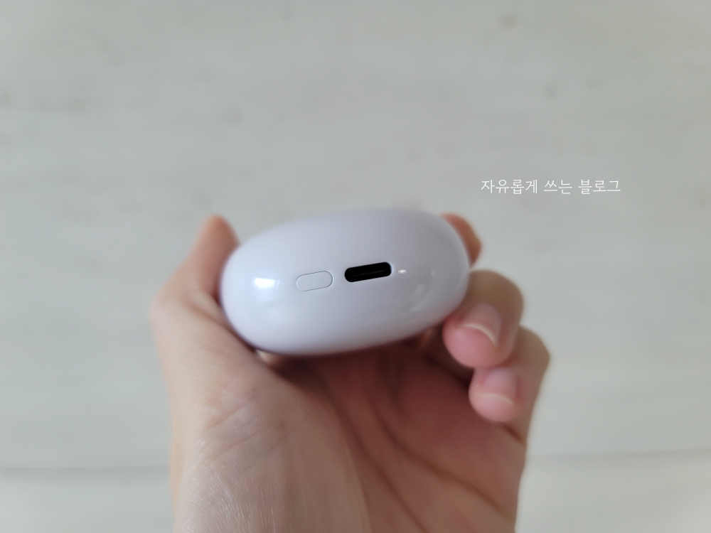 하단에 충전 포트 (usb-c 타입)가 있고, 그 옆에 작은 버튼이 보이는데요.