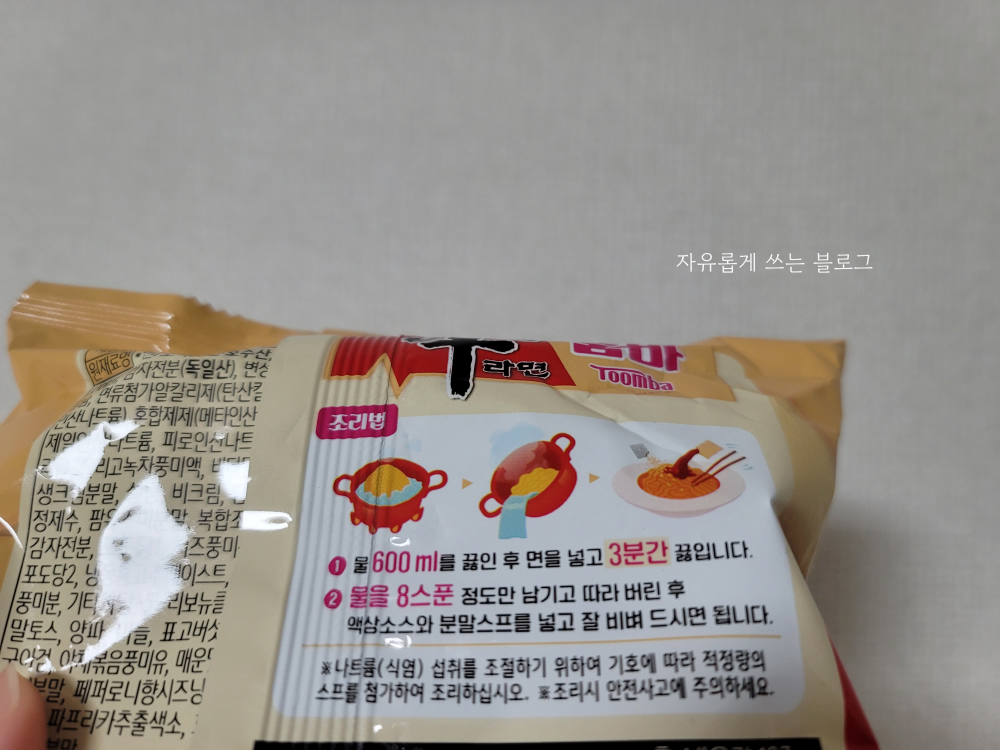 신라면 툼바 조리방법은 물 600ml를 끓여 면을 넣고 3분간 끓인 다음,