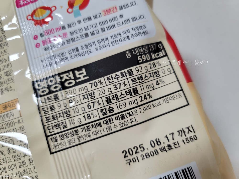 칼로리는 총 내용량 137g 당 590kcal입니다. 소스 때문에 그런건지 라면 치고 살짝 높은 칼로리이긴 하네요.