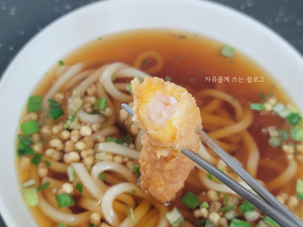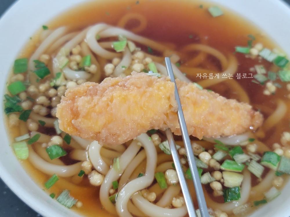 새우튀김은 저처럼 면과 함께 넣어서 끓이면 이렇게 적당히 흐물흐물한(?) 상태가 되는데요.