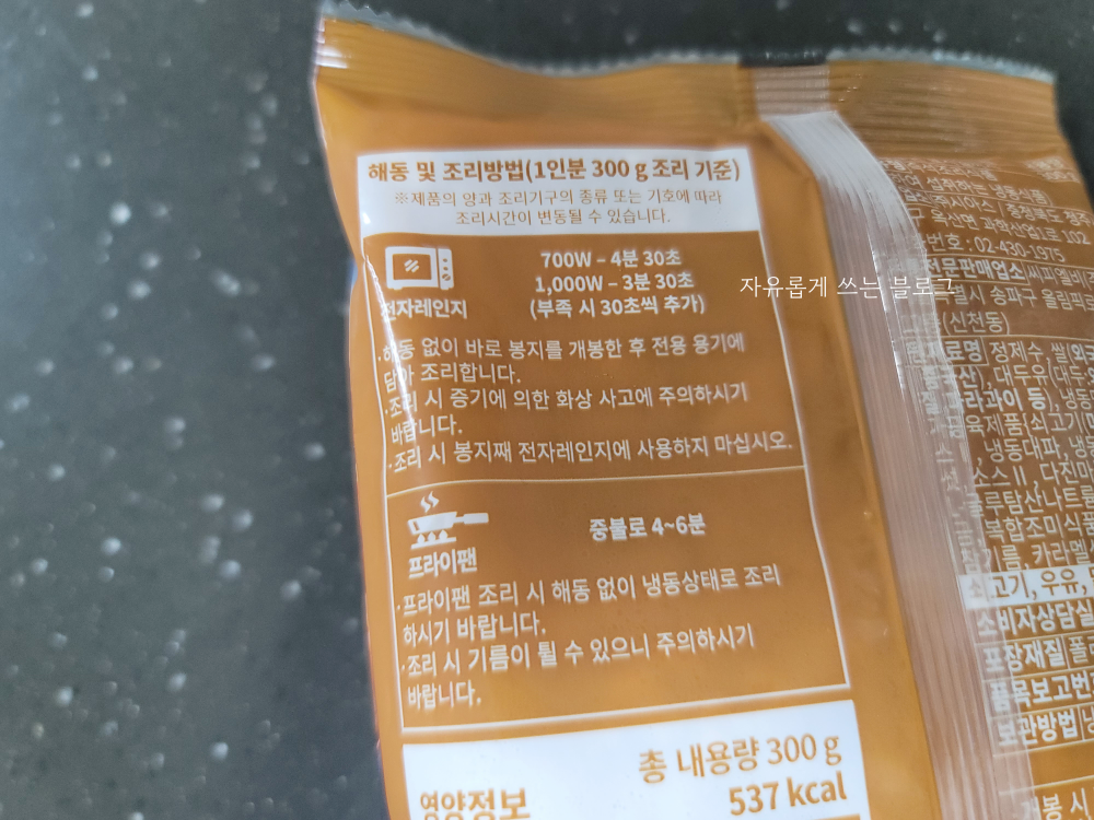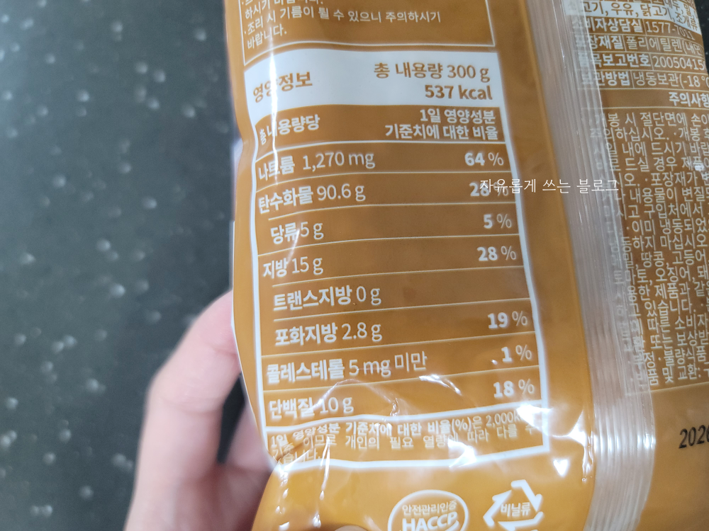 영양정보를 살펴보니 한 팩에 300g, 칼로리는 537kcal입니다.