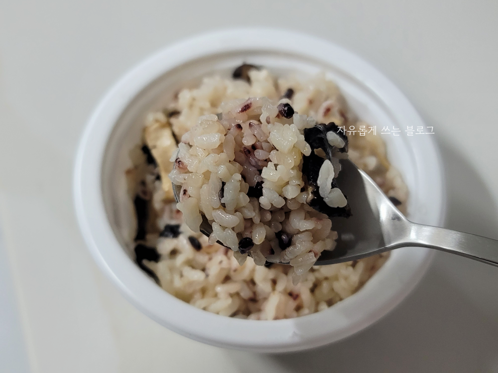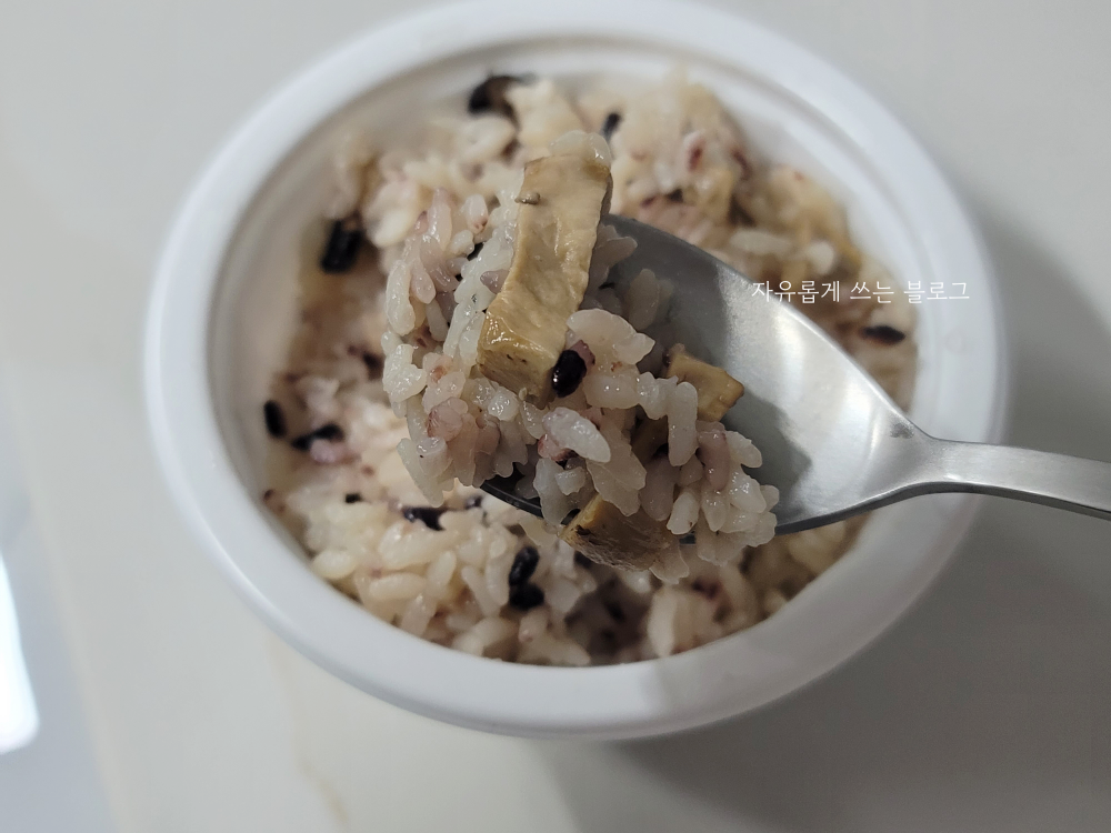 골고루 잘 섞어서 맛을 보았는데요. 버섯이 함께 들어있어서인지 씹는 식감이 정말 좋았습니다.