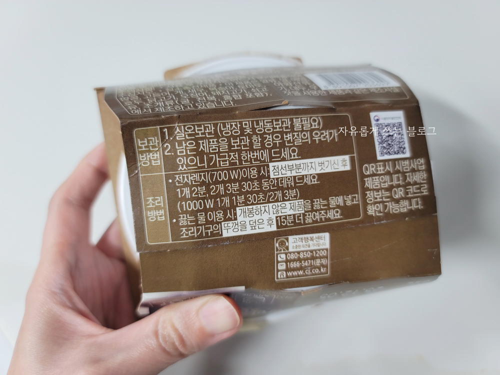 조리 방법은 전자레인지 사용 시에는 점선 부분까지 벗긴 후 2분간 돌려주면 되고,