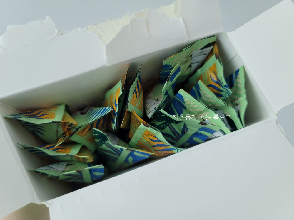 박스를 열어보면 이렇게 개별 포장된 코코넛 믹스커피 15스틱이 들어 있는 것을 볼 수 있습니다.