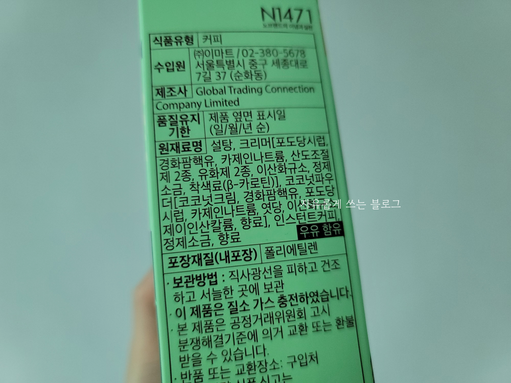 원재료명을 살펴보면 설탕, 크리머, 카제인나트륨 등등이 들어있고, 코코넛파우더도 보입니다.ㅎㅎ