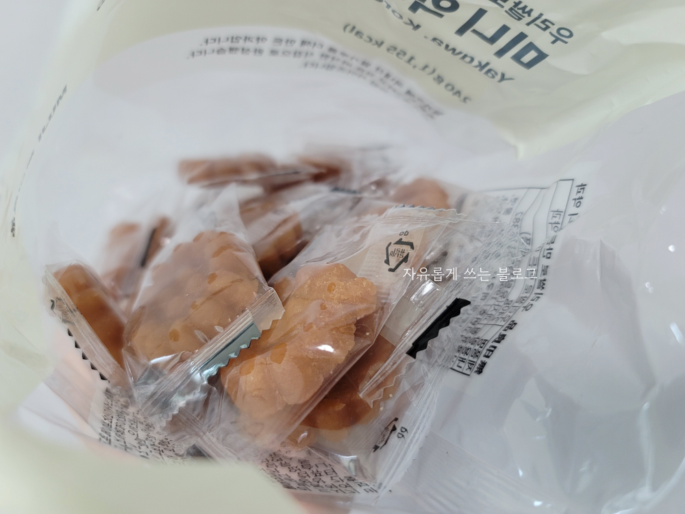 포장을 열면 이렇게 1개씩 개별 포장된 미니 약과가 들어 있는것을 볼 수 있습니다.
