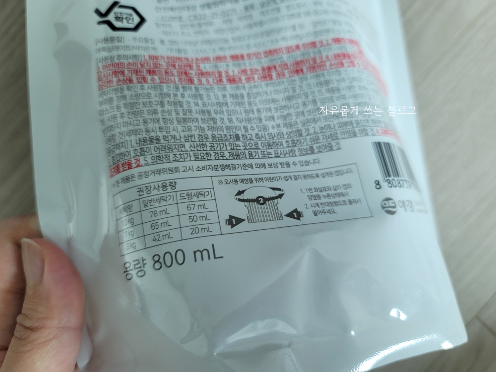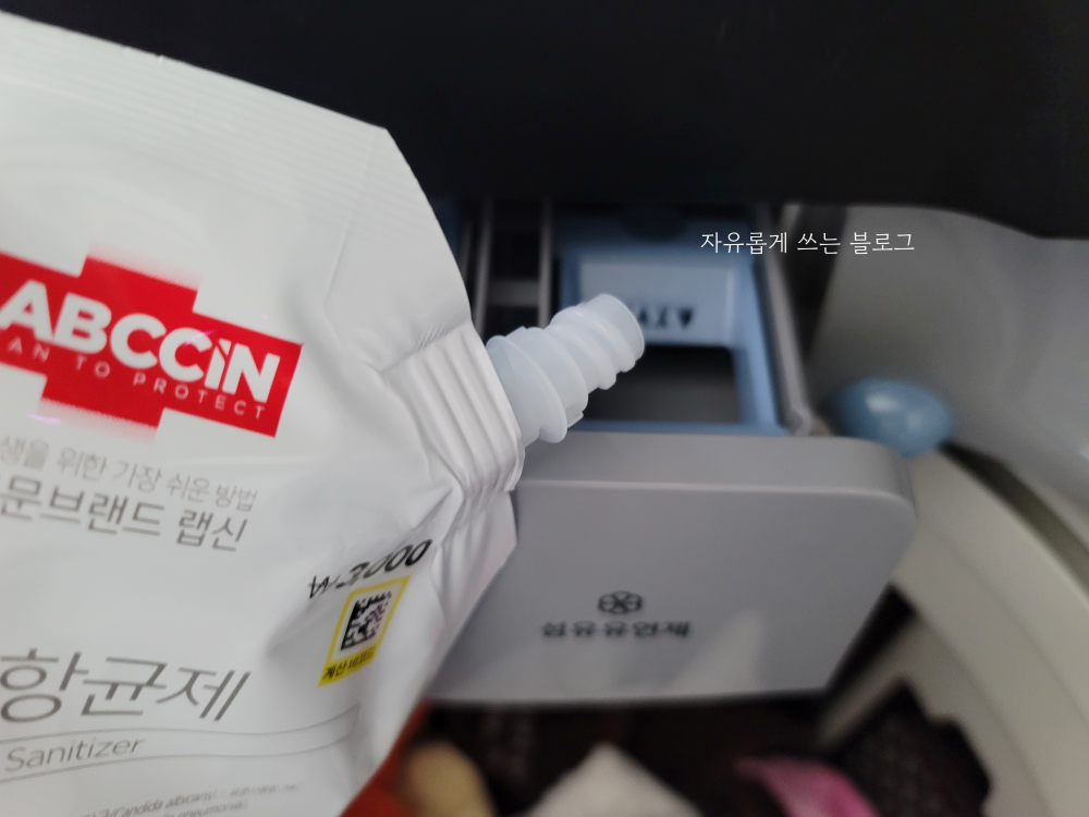 사용할 때는 섬유유연제 넣는 곳에 넣고 평소처럼 세탁기를 돌리면 됩니다.