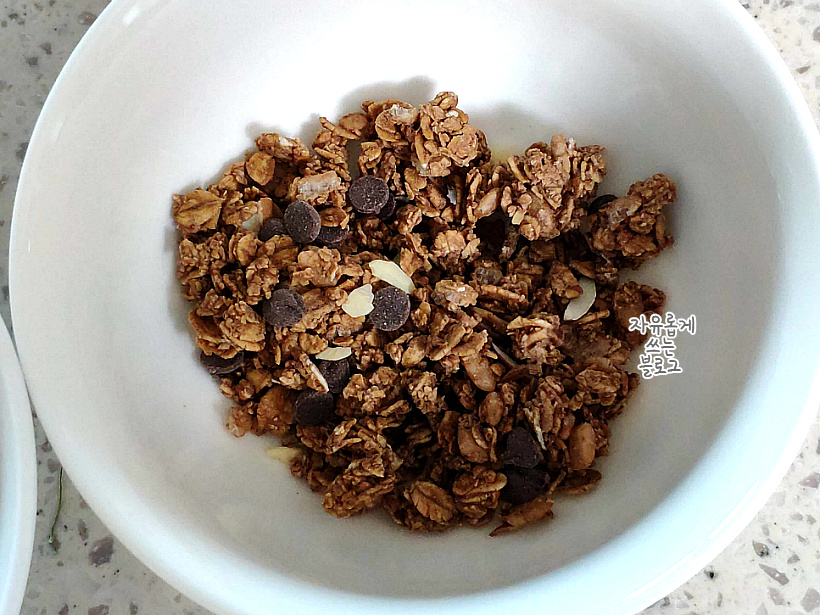 곡물을 뭉쳐 만든 덩어리와 초콜릿 칩, 그리고 아몬드 슬라이스가 보입니다.