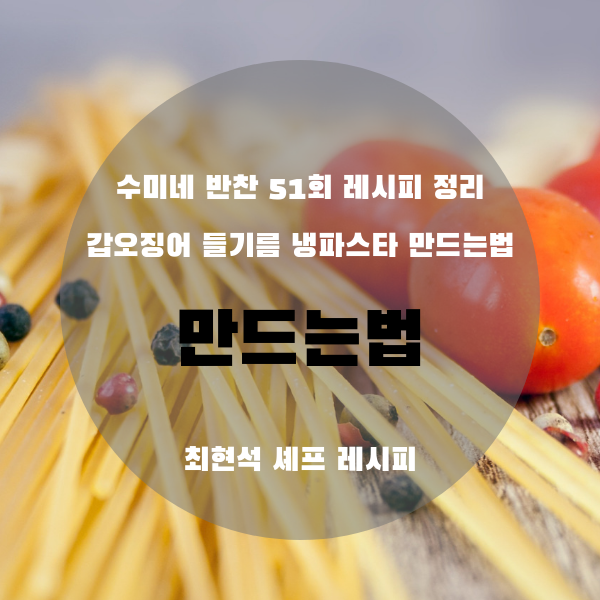그럼 지금부터 수미네 반찬 최현석 셰프님의 갑오징어 들기름 냉파스타 만드는법 정리해보도록 하겠습니다. :)