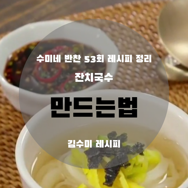그럼 지금부터 수미네 반찬 김수미 선생님의 잔치국수 맛있게 만드는법과 묵은지 쌈밥 만들기 방법 차례로 정리해 보도록 할게요. :)